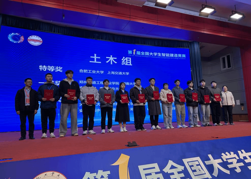 随着人工智能、物联网、大数据等新一代信息技术的蓬勃发展,智能化已成为推动行业转型升级的核心驱动力。国家“十四五”规划明确提出发展智能建造,推动形成绿色、低碳、智能、高效的新型建造模式。2025年12月5日至 7 日在合肥工业大学屯溪路校区举办第一届全国大学生智能建造竞赛决赛。土木工程学院师生在首届全国大学生智能建造竞赛中,与来自上海交通大学、武汉大学、湖南大学等47所高校的代表队同台竞技,最终荣获土木组全国二等奖。